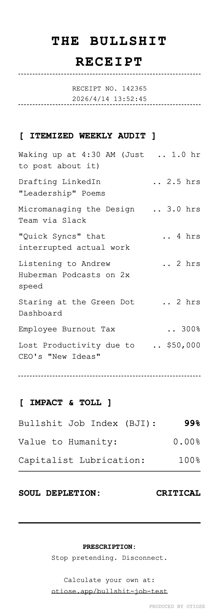 Audit Result | The Bullshit Job Test | Calculate Your Corporate Burnout