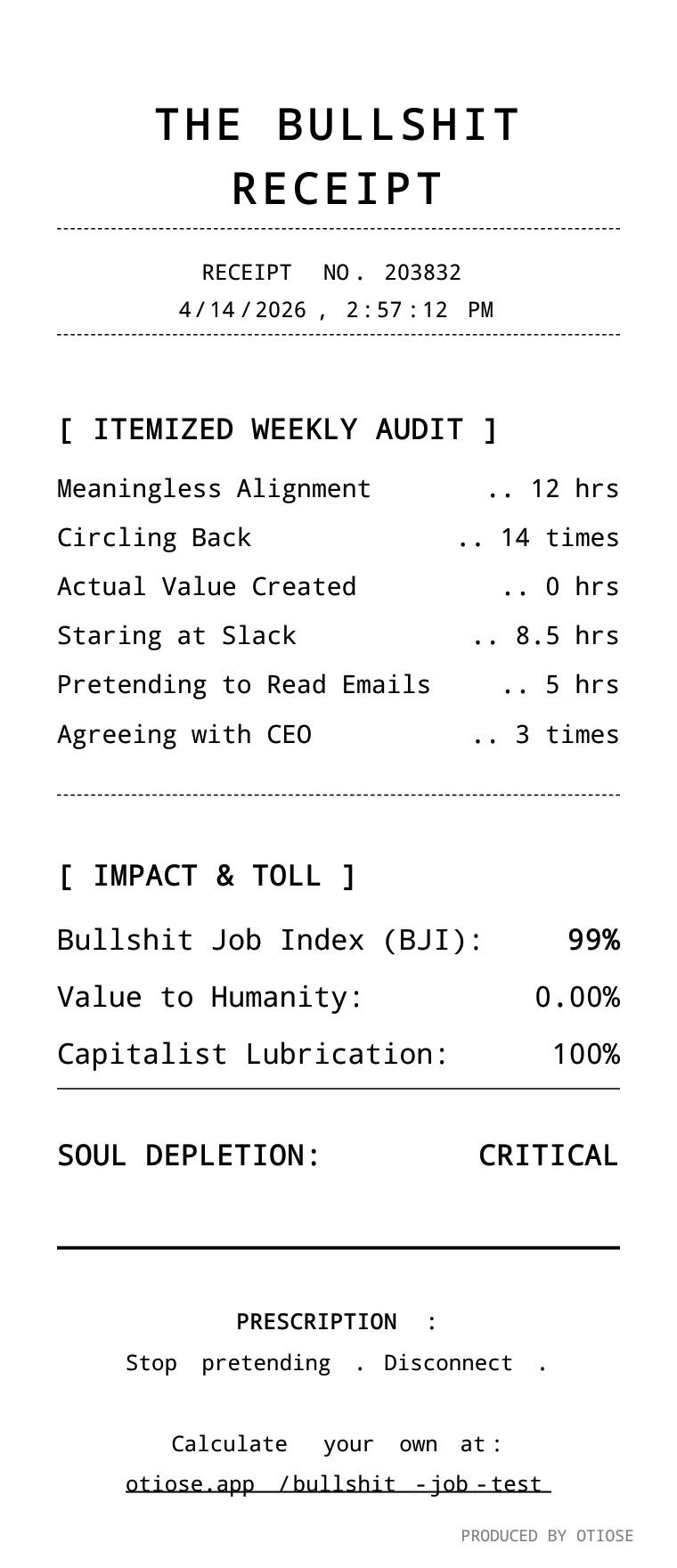 Audit Result | The Bullshit Receipt | Calculate Your Corporate Burnout