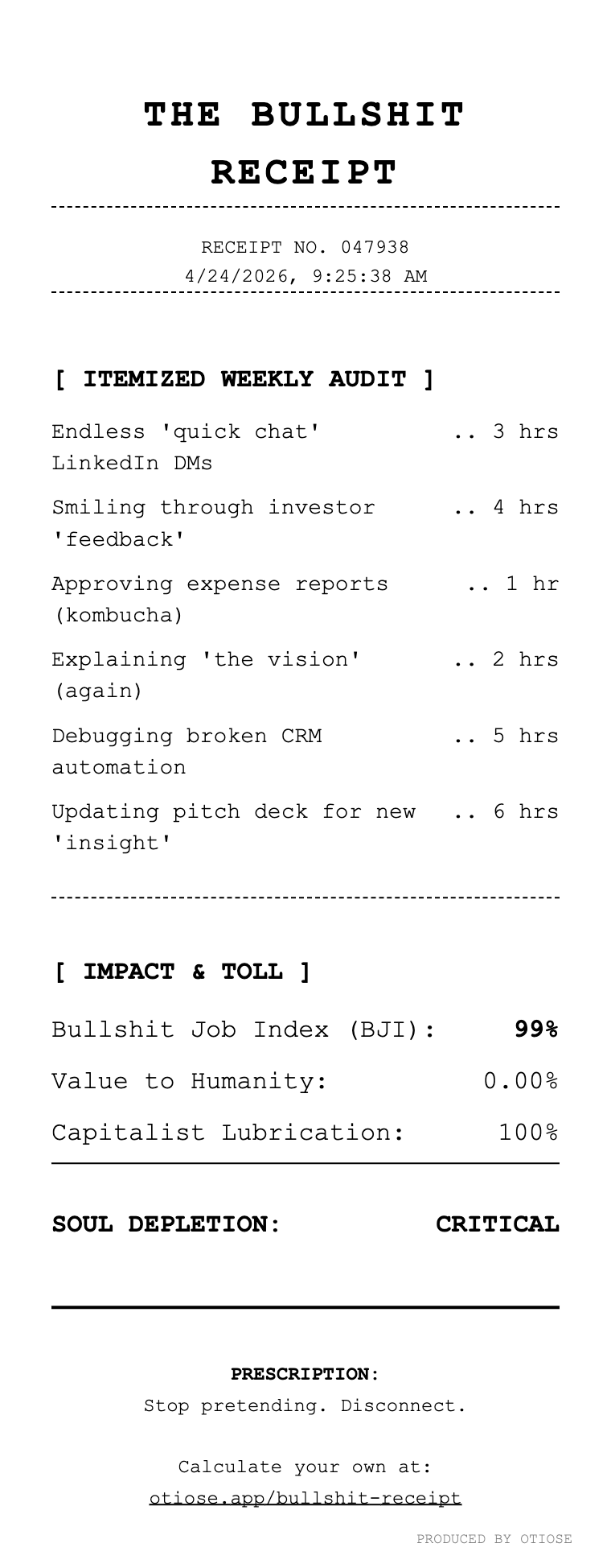 A CTO (Chief Technology Officer) calculated their soul depletion.
